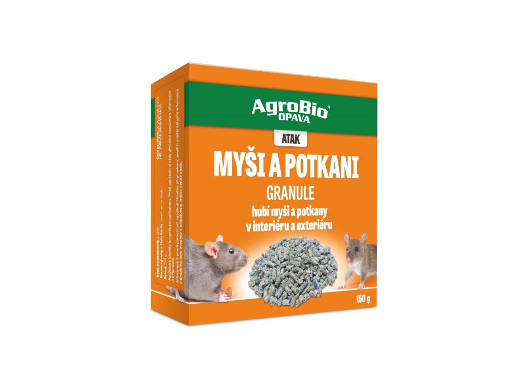 Požerová nástraha k hubení myší domácích a potkanů ve formě granulí.